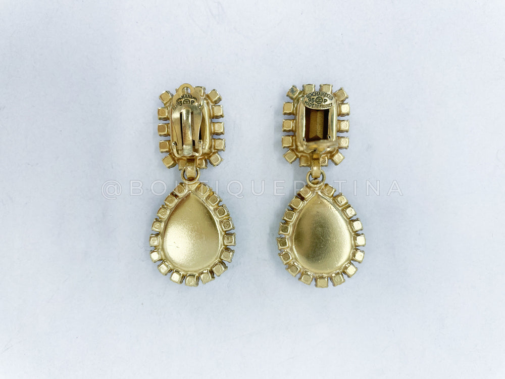 Chanel had these earrings in 1995 Spring/Summer collection and the 1995 Barbie collection. Fashioned like their Byzatine/Gripoix brooches, they are made of rhinestones, crystal and glass on gold plating. These earrings come in a variety of colors.