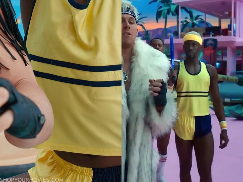 The costume department made almost all of the beach fight outfits. His top and shorts are custom made, appearing to be nylon. They are based on 80’s and 90’s athletic jersey shorts (still sold for colleges in this design). The elastic thread is stitched invisibly and only across the front and back, not around the hips. More details can be seen in the IJK Behind The Scenes video.