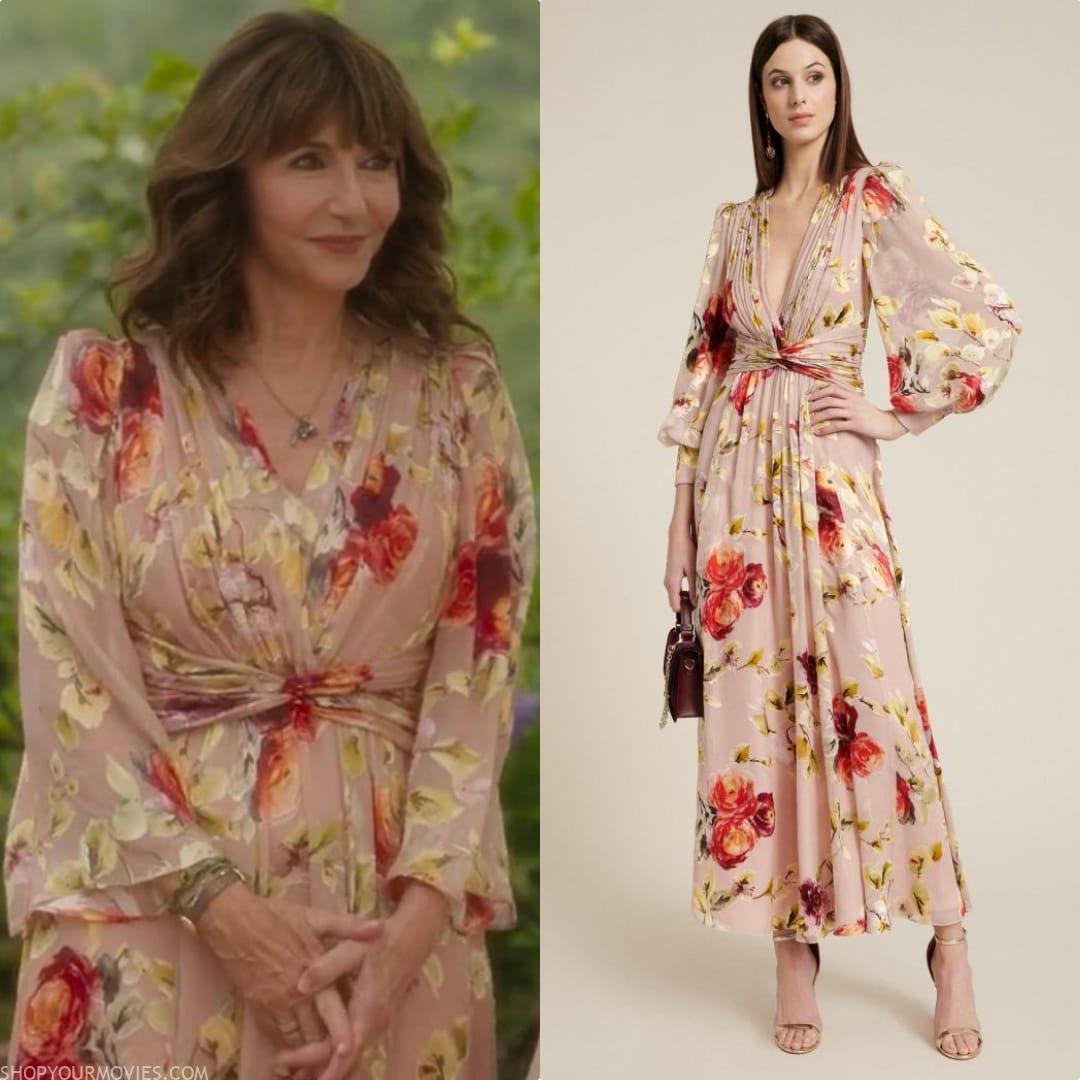 Long Georgette Dress with Floral Print, V-Neck, Wide Sleeves and Covered Buttons