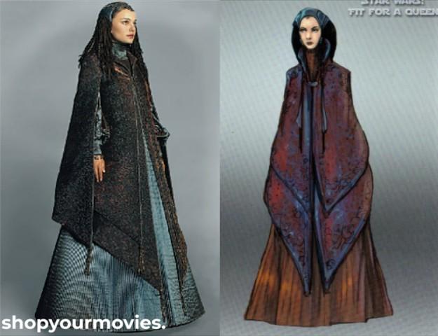 • Description: Overdress made of blue and brown shot satin is worn over a hooped petticoat. Tightly pleated along the skirt and sleeves. The next layer is a cape made of layered triangular pieces of devoré velvet in brown and blue. Beaded tassels hanging from the points and silken scrollwork inlaid with Naboo symbols.