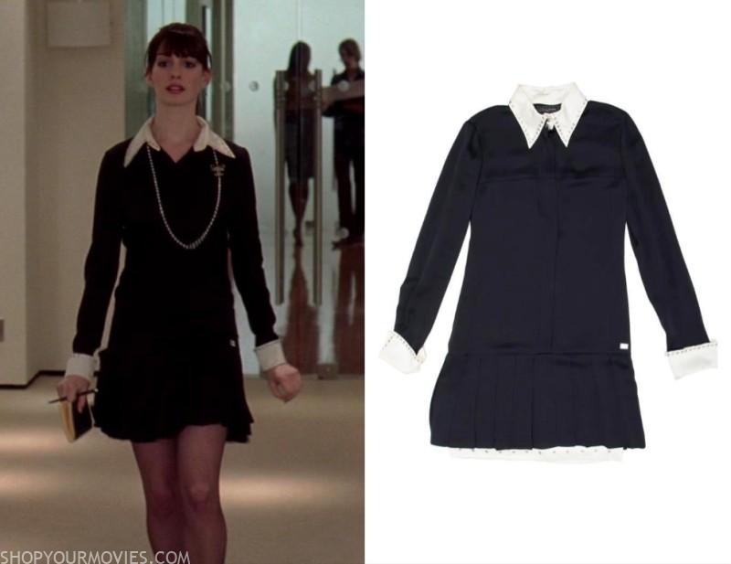 - Description: Black long sleeved dress with dropped waist and pleated skirt. White collar and cuffs with silver metal snap embellishments. White underskirt was removed for the movie.