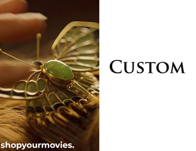 Rose’s hair comb was based on an antique. There are many replicas of various quality that can be found for sale but none are completely accurate to the original. On the officially licensed replica sold by J. Peterman, the butterfly’s antenna are pressed outwards and almost touching the wings. The wing tips are black. It has ten tines on the comb and is marked 1998 Fox. Another version was made by Jill Bailey and has seven tines on the comb, and the butterfly has dark blue wing tips.