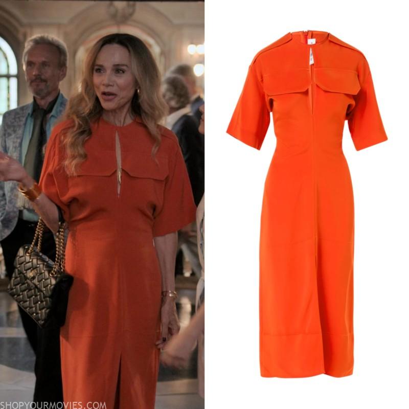- Description: Arancione cut-out midi dress from VICTORIA BECKHAM featuring tangerine orange, mid-length, front slit, cut-out detailing, two front cargo pockets and slim cut.