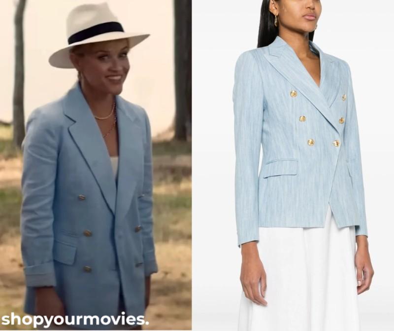 You’re Cordially Invited: Margot’s Light Blue Chambray Double Breasted Blazer